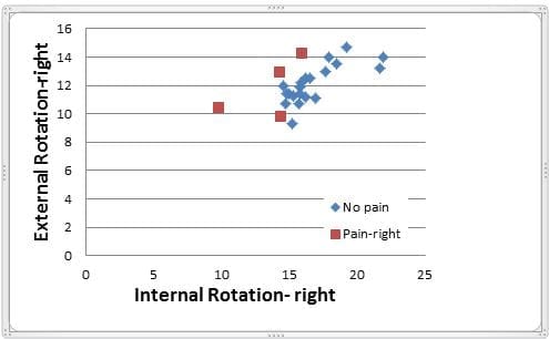 Figure 1. Graph of external rotation and internal rotation force production for the right shoulder of female members of the 2012 Australian Olympic swim team. Units are in kilograms. Swimmers’ shoulders were classified as symptomatic if, in the 12 months prior to testing, symptoms were significant enough to cause cessation of training for any period of time. Note the symptomatic shoulders show a greater tendency toward reduced internal rotation force production in comparison with asymptomatic shoulders.